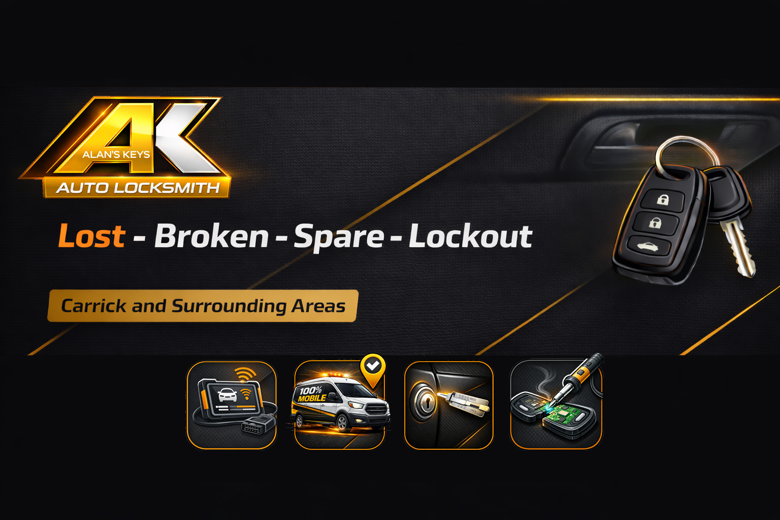 I operate everything out of my fully equipped van. I come to you for all jobs, and in most cases I can do whats needed in one visit to your home or work place. Obvioulsy you don't have much choice in a Lost Key or Lockout situation, but Spare Keys and Repairs are also carried out mobile.
